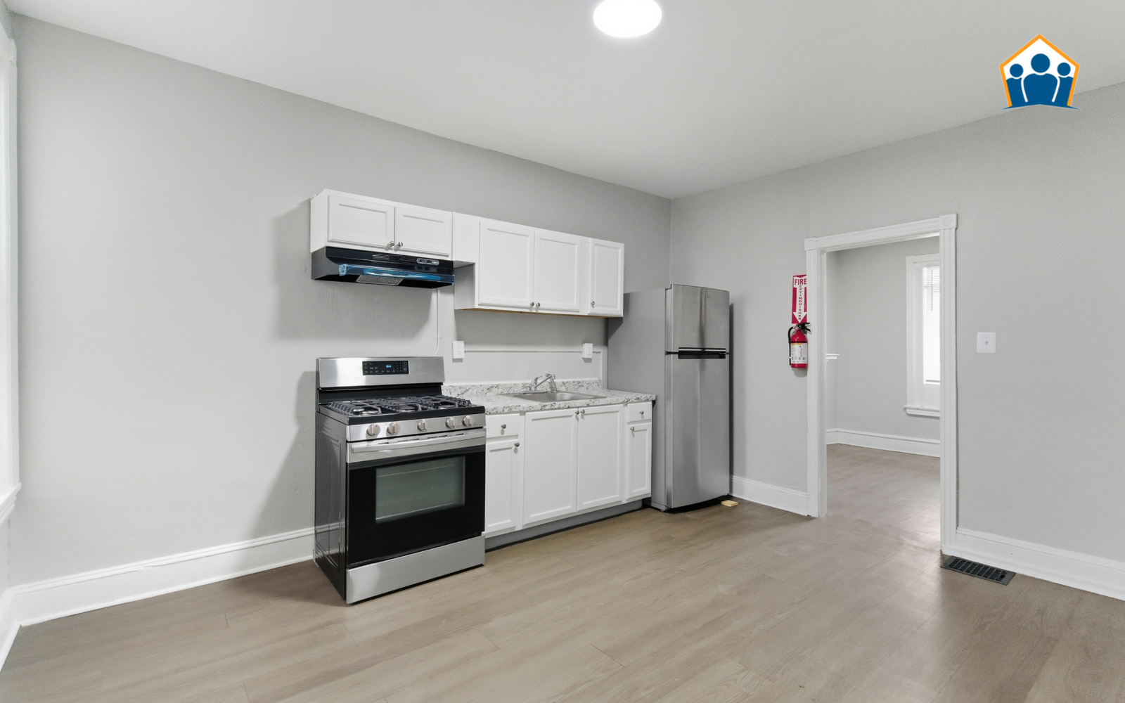 The home has been newly renovated to include fresh paint and durable new flooring throughout. The kitchen is simple and efficient, providing brand-new cabinetry and essential appliances. Both bedrooms are well-sized for the footprint, and the bathroom has been refreshed with modern, standard hardware for a tidy, consistent look.